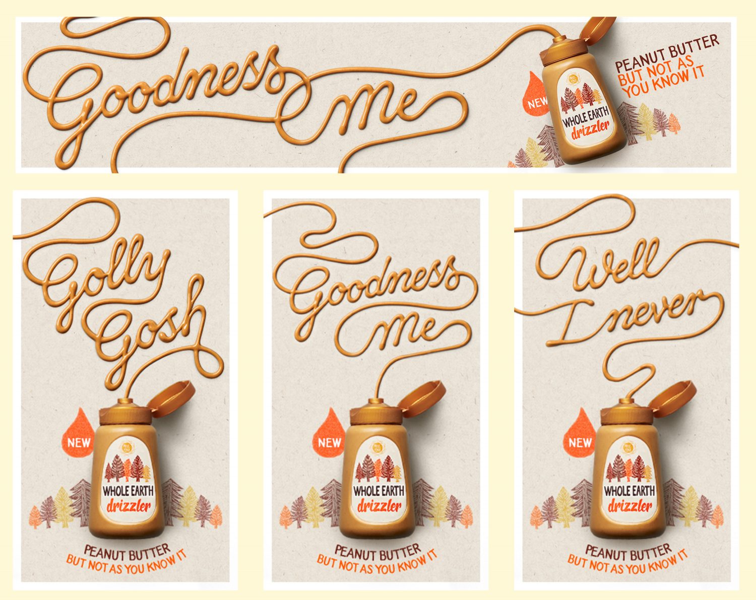Alison worked on several headlines that allow the trail of peanut butter to loop and curve into beautiful hand written lettering masterpieces, it was my job to ensure they stayed 3D and the puzzle of various crops, loops and squiggles worked with ease as well as shooting the pack shot too.